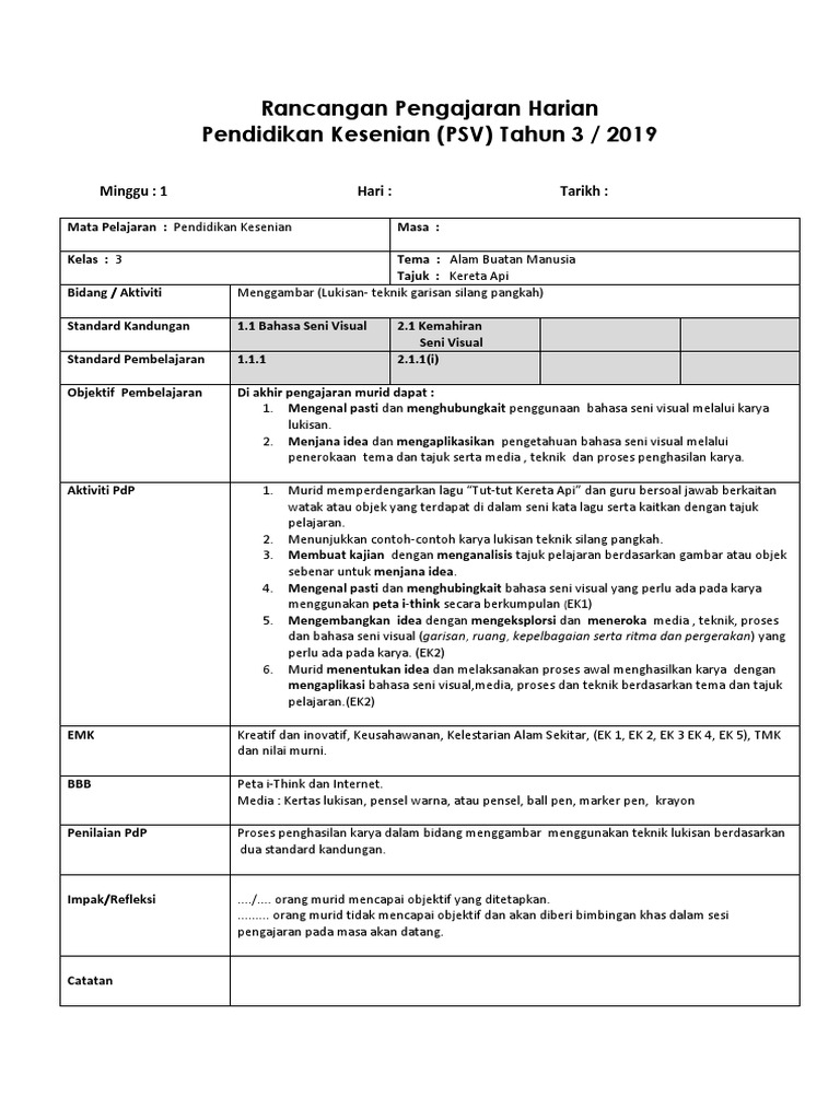 Rph Pendidikan Seni Visual Psv Tahun 3 Kssr Rancangan Mengajar Harian